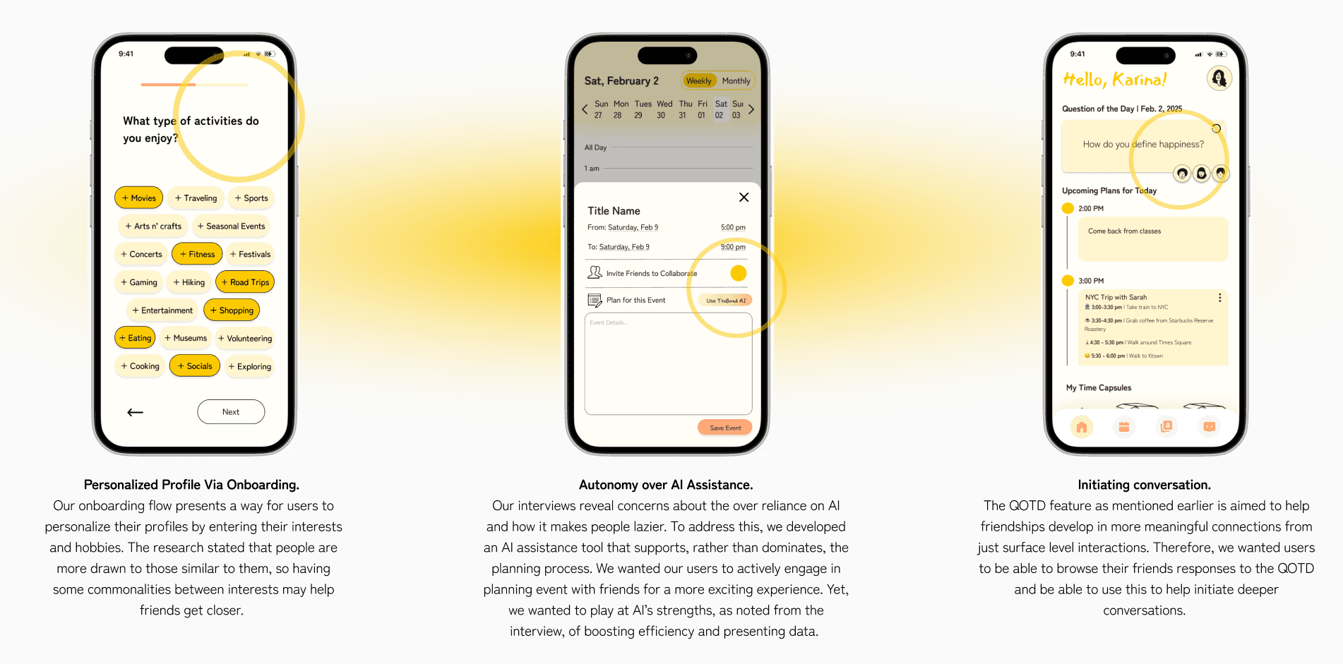 From our survey, we discovered a few key statistics: (1) 85.7% of participants are motivated to reach out to others when they have a shared interest, (2) 66.7% mostly interact with others offline, (3) 90.5% of participants do not use AI for relationship advice. The last statistic showcases our participants’ understanding of AI’s limitation to have emotional connection. They mainly use AI for educational or career purposes. These insights point to the fact that humans desire emotional, real relationships.