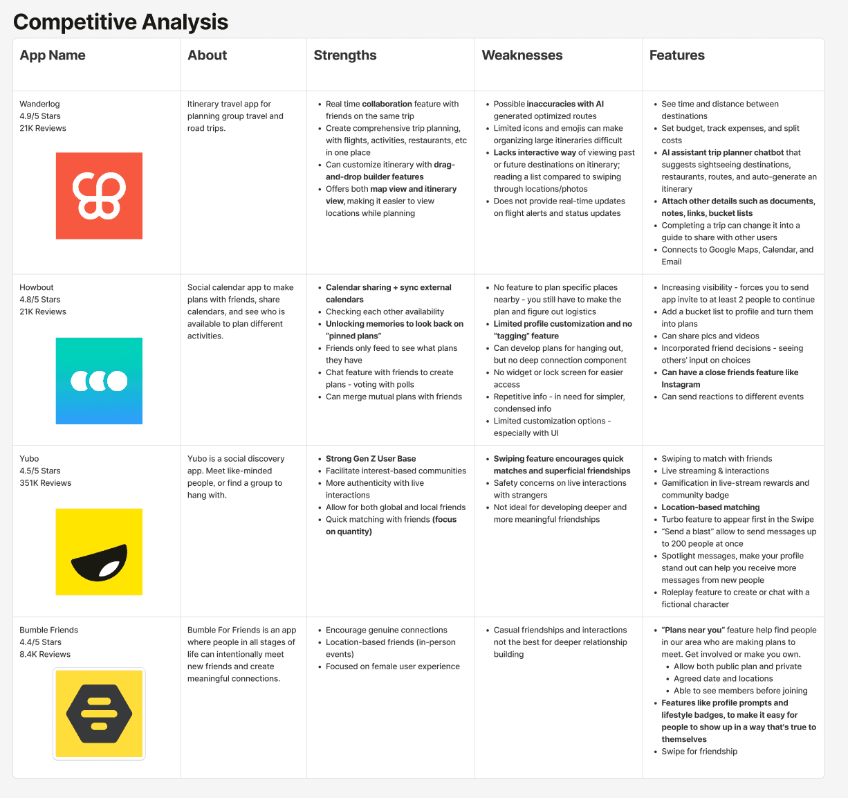 We analyzed popular itinerary planning and friendship building platforms such as Wanderlog, Howbout, Yubo, and Bumble For Friends. We identified their strengths being real time communication with others, interactive calendar syncing, and having a lot of freedom and control in the features. These findings prompted us to create a collaborative itinerary planner that helps foster deeper communication and relationships, while including some other components that supported the main purpose of the application.